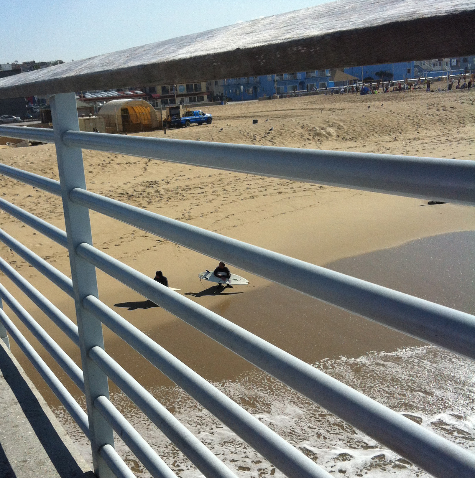 Surfers dotted the water near the pier